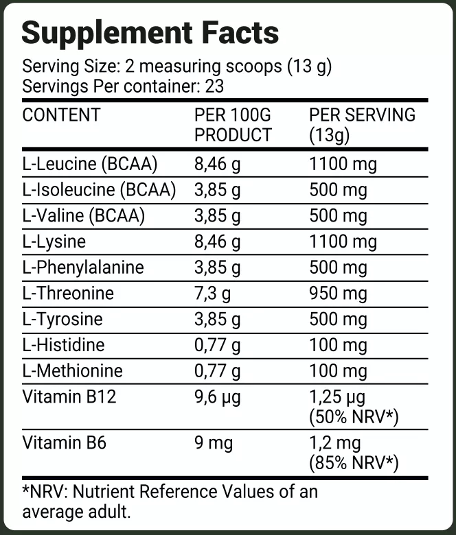 A full verified amino-by-amino milligram breakdown was not clearly available in the sources I could confirm online, so for label accuracy it is best to copy the exact per-serving amounts directly from your physical tub before publishing. The confirmed online details are the 300 g size, about 23 servings, all 9 EAAs, and added vitamins B6 and B12.
